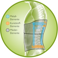 Die Orthese besteht aus einem festen Rahmen aus thermoplastisch verformbarem Kunststoff und Metall sowie einem kompressionsstarken textilen Mieder. Sie umschließt den BWS-/LWS-Bereich und reicht ca. von Mitte Gesäß bis über die Schulterblätter. Seitlich befinden sich unterschiedliche, gut abgepolsterte Skoliosebügel aus Metall, die je nach den patientenindividuellen Erfordernissen wie linkskonvexe oder rechtskonvexe adulte Skoliose angeformt werden.